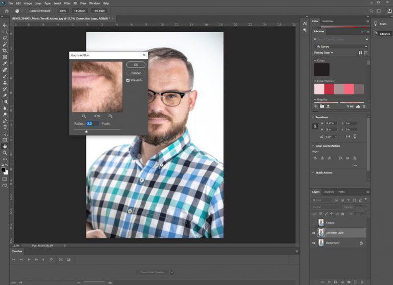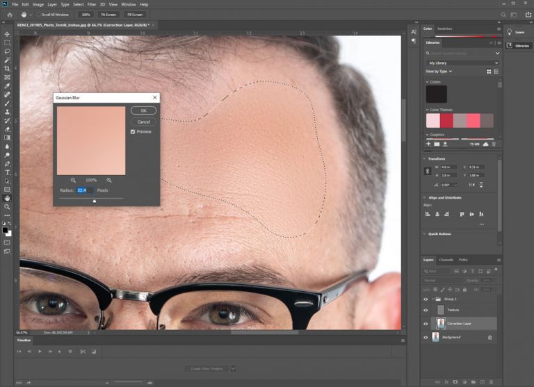 Use the lasso tool to select an area on the subject’s skin that has a blemish that you wish to remove. These blemishes can be skin redness or just general blotchy skin. Personally, I would not use this method to correct acne because that means texture needs to be retouched, too (see the end of this tutorial). Once you have the area selected, use the Gaussian Blur function, from earlier steps, and use your discretion on the amount needed to blend the skin color/ blemish away. If you still have the “Texture” layer visible, you can see the result immediately. Continue to do this unless all the blemishes and skin redness is removed to your satisfaction.