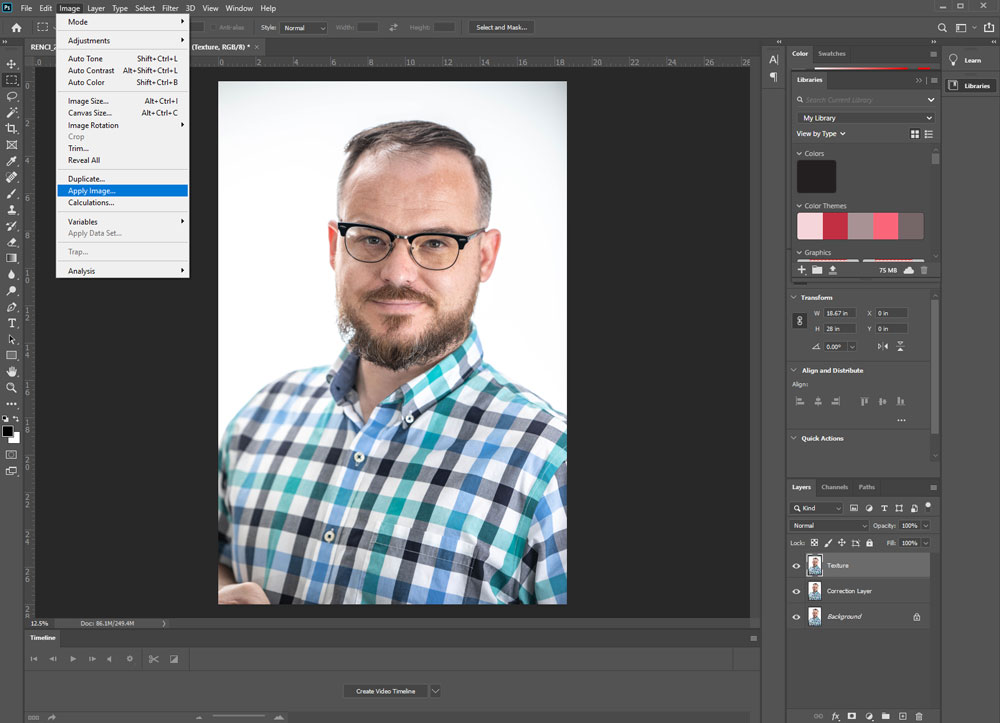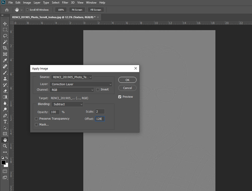 At this point, reselect the eye icon next to the “Texture” layer to make that layer visible again. Select the “Texture” layer. The witchcraft in mathematics has been done by smarter people than myself, so trust me on what I am about to tell you. With this layer selected, select Image > Apply from the top bar. This will trigger a pop-up window.