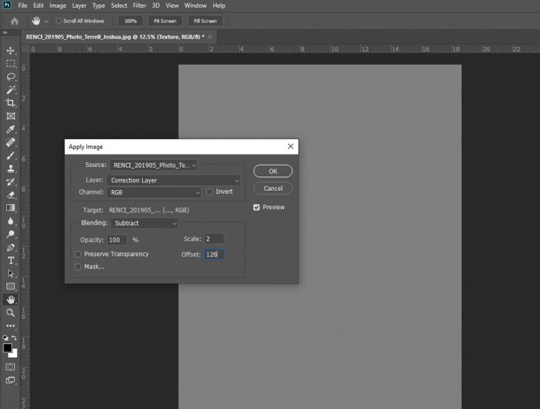 In this pop-up window, change the layer to the “correction layer.” Set the blending mode to “Subtract,” scale to “2”, and the offset to “128”. The math is good, and it works so that it will be right for every image with skin. Now, we have these numbers and settings sets, click “OK.” This won’t look good and may appear like a low pass filter image, but don’t worry. Proceed on.