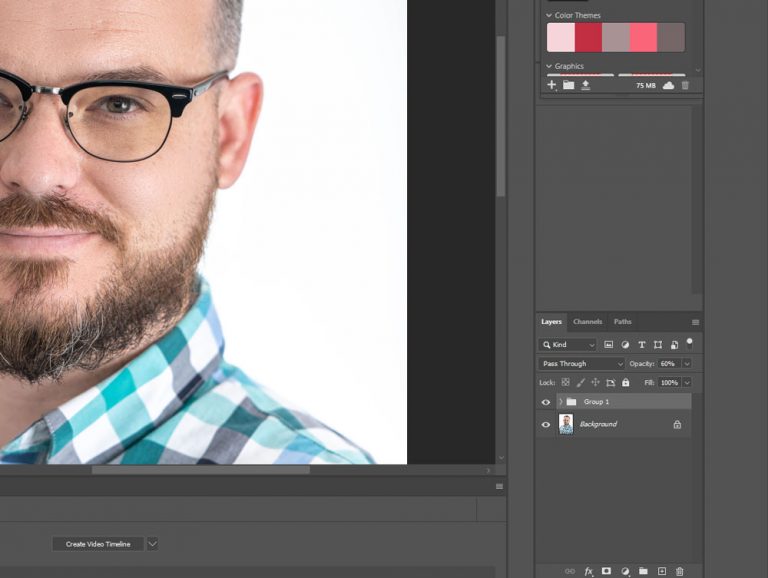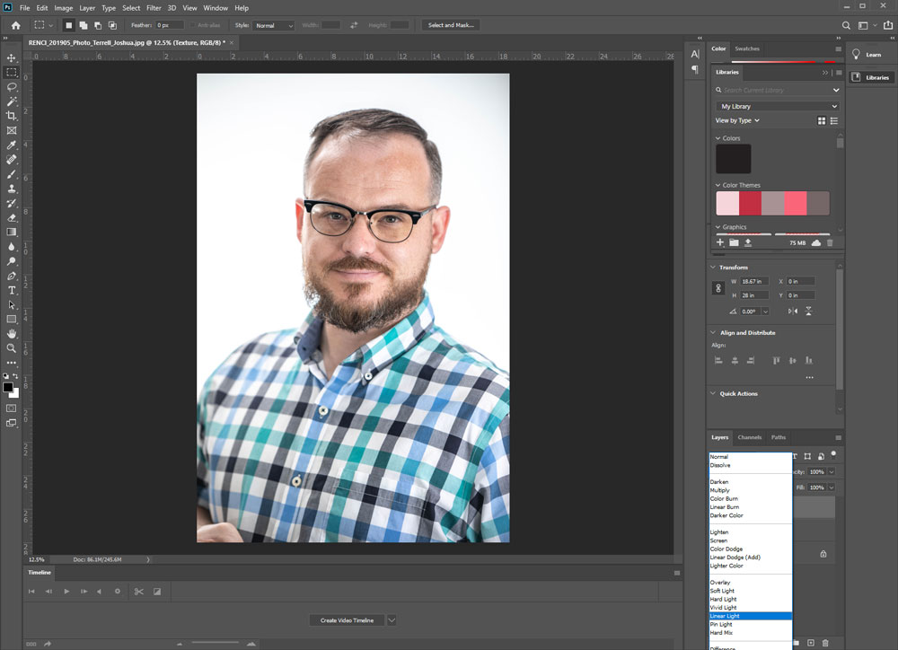 Before we move on to the fun stuff on other layers, change the “Texture” layer’s blending mode in the layers tab to “Linear Light.” To keep things organized, put the Texture and Corrections layer into one “Group” folder by selecting both (click and hold shift to click both) and clicking the folder icon at the bottom of the Layers panel. Now we are set to do the skin retouching to fix those blemishes.