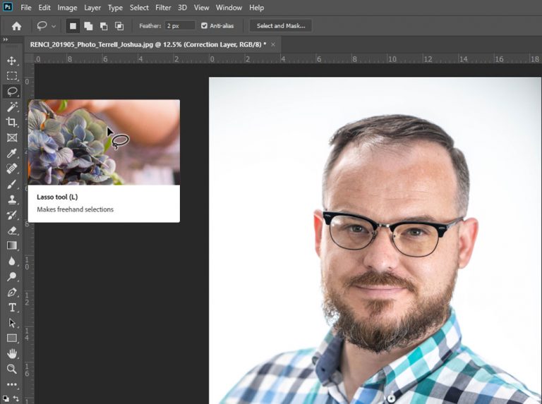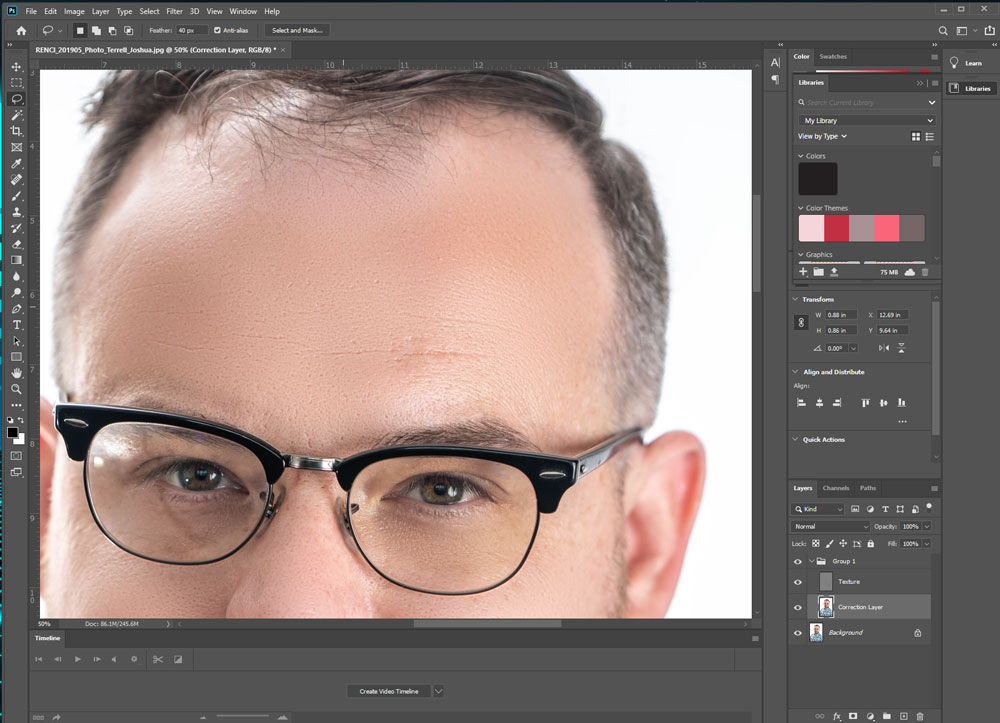 Select only the “Correction” layer in the group folder and select the “lasso” selection tool in the Tools panel. Set the feather to have a “soft” outlet so your area chosen won’t have hard borders when you finish making your corrections. I generally like to make the feather between 20px and 40px depending on the resolution of the original image.