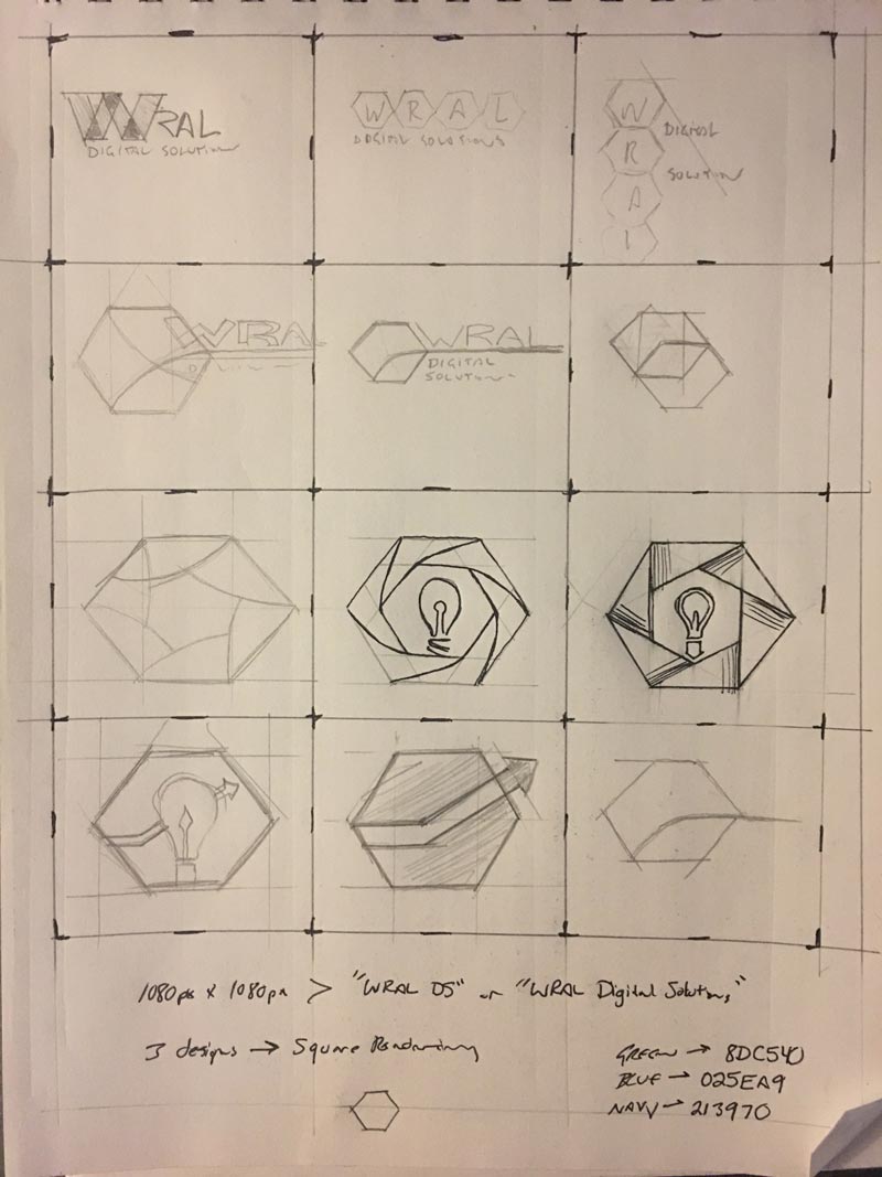 WRAL Digital Solutions pitched a Logo Design Contest that was open to anyone that wished to submit a design. I designed a logo that played on the hexagon motif and color from their current branding in order to maintain the familiarity of this highly recognized brand in North Carolina. This design placed in the contest and successfully integrates with the brand as intended.